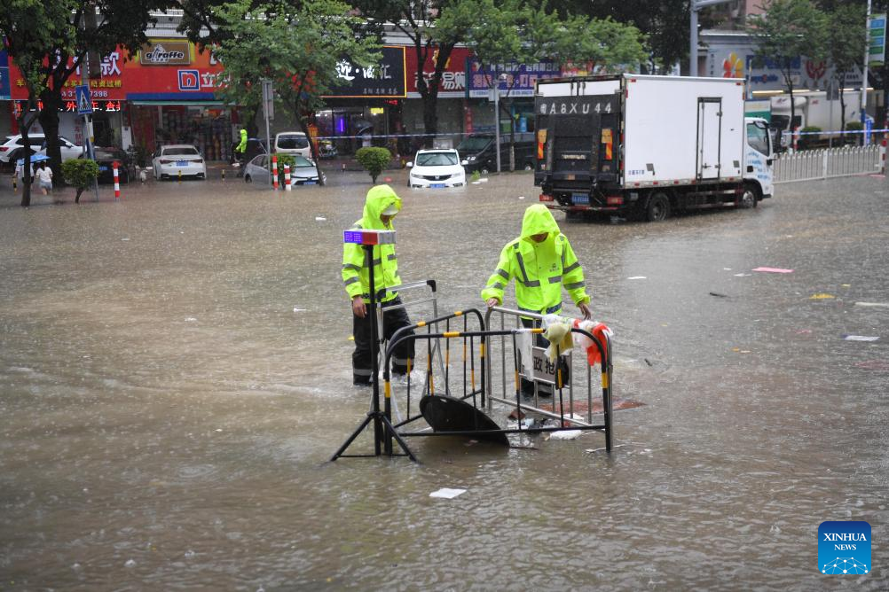 Staff members fence off a manhole on a flooded road in Panyu District of Guangzhou, south China's Guangdong Province, Sept. 8, 2023.