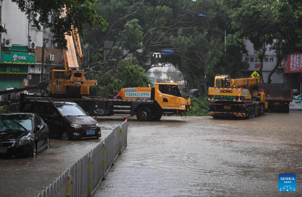 Workers remove fallen trees in Panyu District of Guangzhou, south China's Guangdong Province, Sept. 8, 2023.