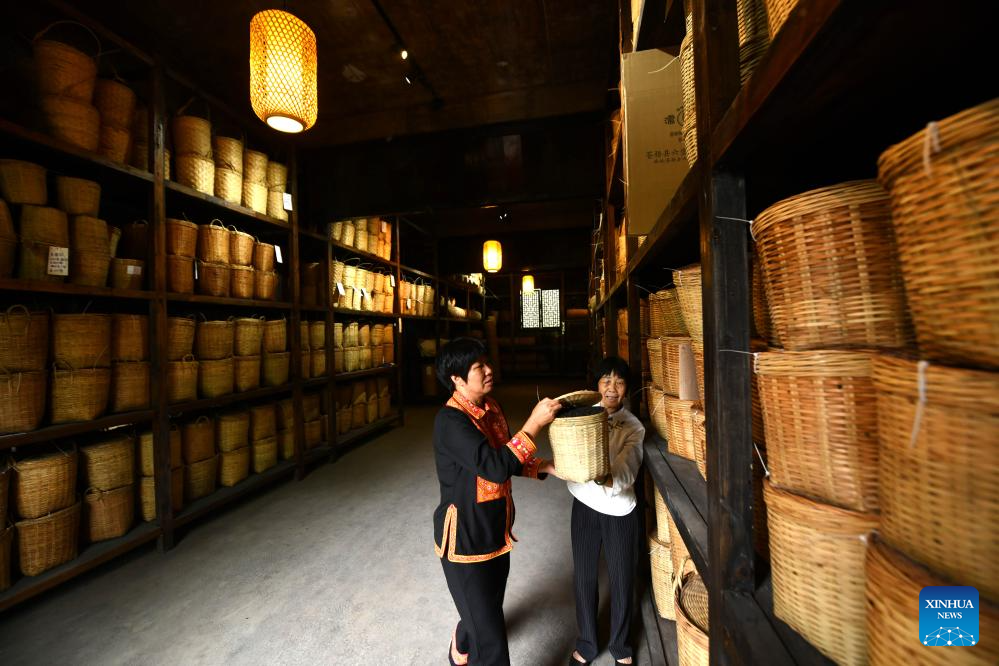 A worker arranges baskets in a tea company in Wuzhou City, south China's Guangxi Zhuang Autonomous Region, June 8, 2023. (Xinhua/Huang Xiaobang)