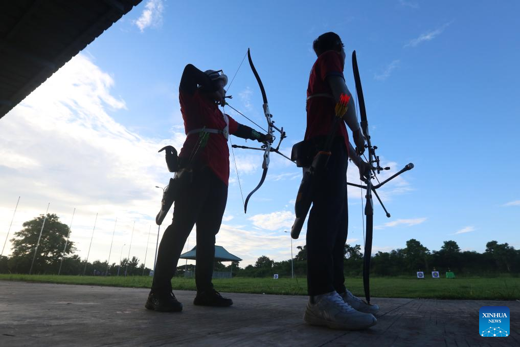Myanmar's archery athletes attend a training session for the 19th Asian Games in Hangzhou at an archery field in Nay Pyi Taw, Myanmar, Sept. 7, 2023. Myanmar will send 111 athletes to the 19th Asian Games in Hangzhou, China, an official from Myanmar's Ministry of Sports and Youth Affairs said. (Photo by Myo Kyaw Soe/ Xinhua)
