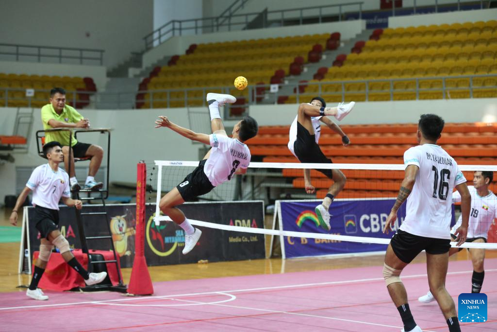 Members of Myanmar's national sepak takraw team attend a training session for the upcoming 19th Asian Games in Hangzhou at Wunna Theikdi Indoor Stadium in Nay Pyi Taw, Myanmar, Sept. 7, 2023. Myanmar will send 111 athletes to the 19th Asian Games in Hangzhou, China, an official from Myanmar's Ministry of Sports and Youth Affairs said. (Photo by Myo Kyaw Soe/ Xinhua)