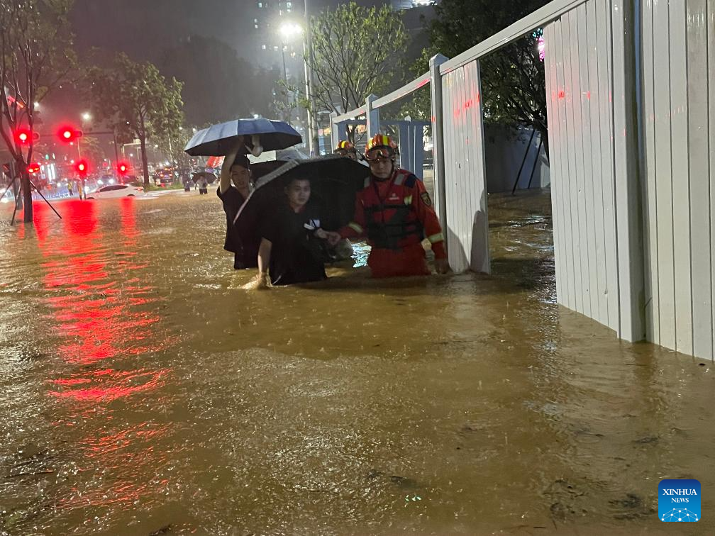 Firefighters transfer stranded residents in Longgang District of Shenzhen, south China's Guangdong Province, Sept. 7, 2023. Extremely heavy rainstorm has lashed Shenzhen since Thursday night, according to the municipal meteorological bureau. (Photo by Wei Weijia/Xinhua)