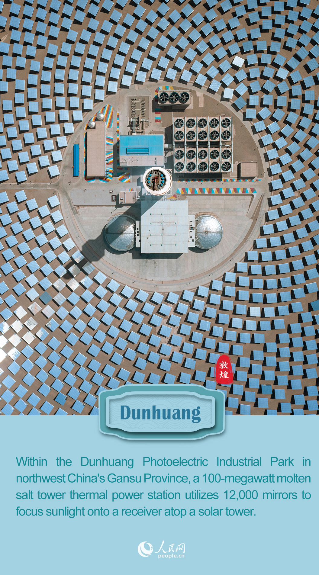 Within the Dunhuang Photoelectric Industrial Park in northwest China’s Gansu Province, a 100-megawatt molten salt tower thermal power station utilizes 12,000 mirrors to focus sunlight onto a receiver atop a solar tower.