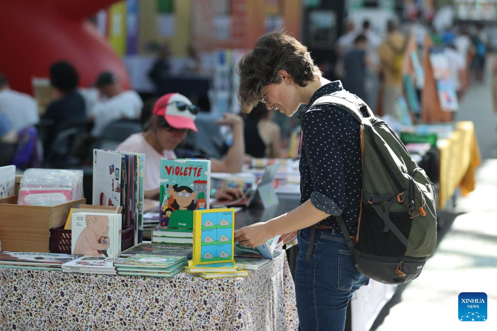 A visitor reads a comic book during the BD Comic Strip Festival in Brussels, Belgium, on Sept. 8, 2023. The BD Comic Strip Festival kicked off here on Friday. (Xinhua/Zhao Dingzhe)