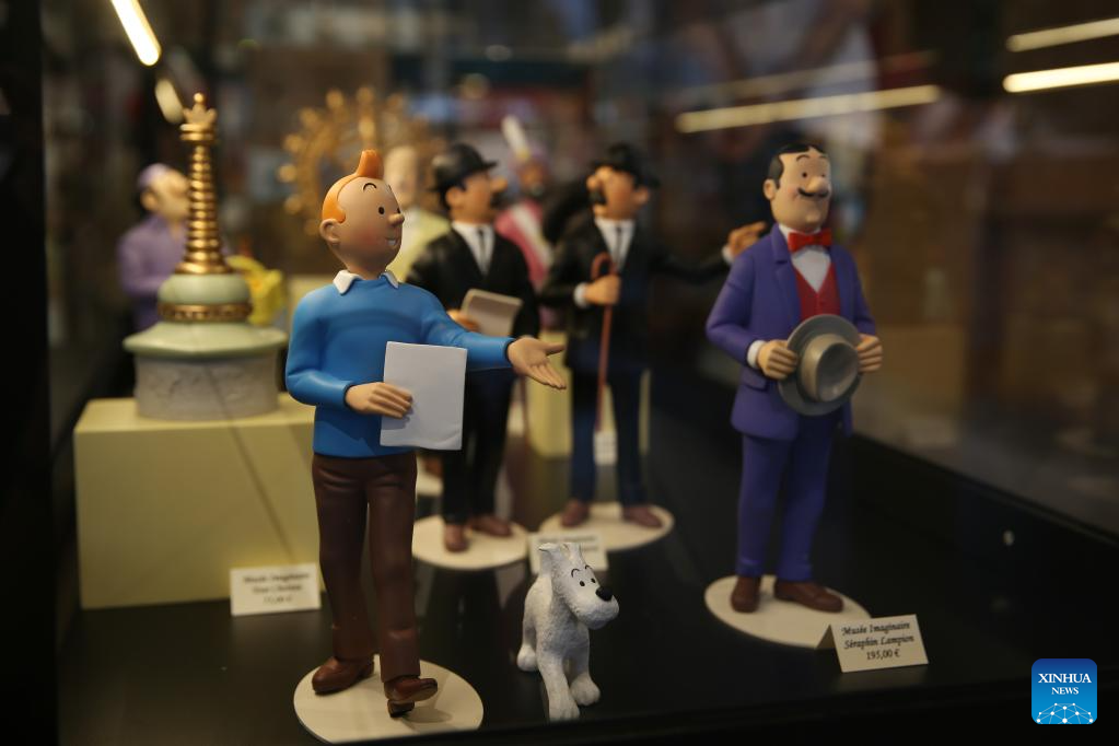 Toy models of Tintin and other figures based on the comic series The Adventures of Tintin are seen during the BD Comic Strip Festival in Brussels, Belgium, on Sept. 8, 2023. The BD Comic Strip Festival kicked off here on Friday. (Xinhua/Zhao Dingzhe)