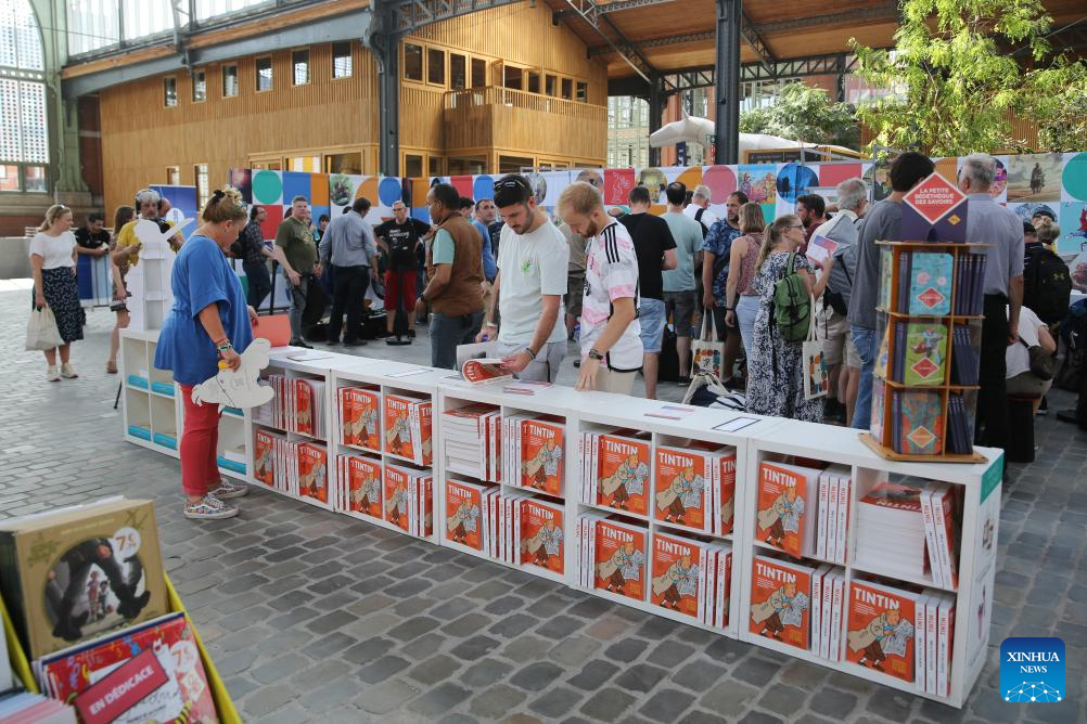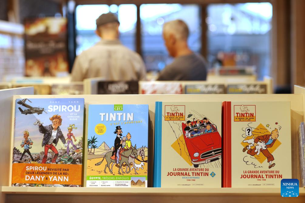 Comic books are on display during the BD Comic Strip Festival in Brussels, Belgium, on Sept. 8, 2023. The BD Comic Strip Festival kicked off here on Friday. (Xinhua/Zhao Dingzhe)