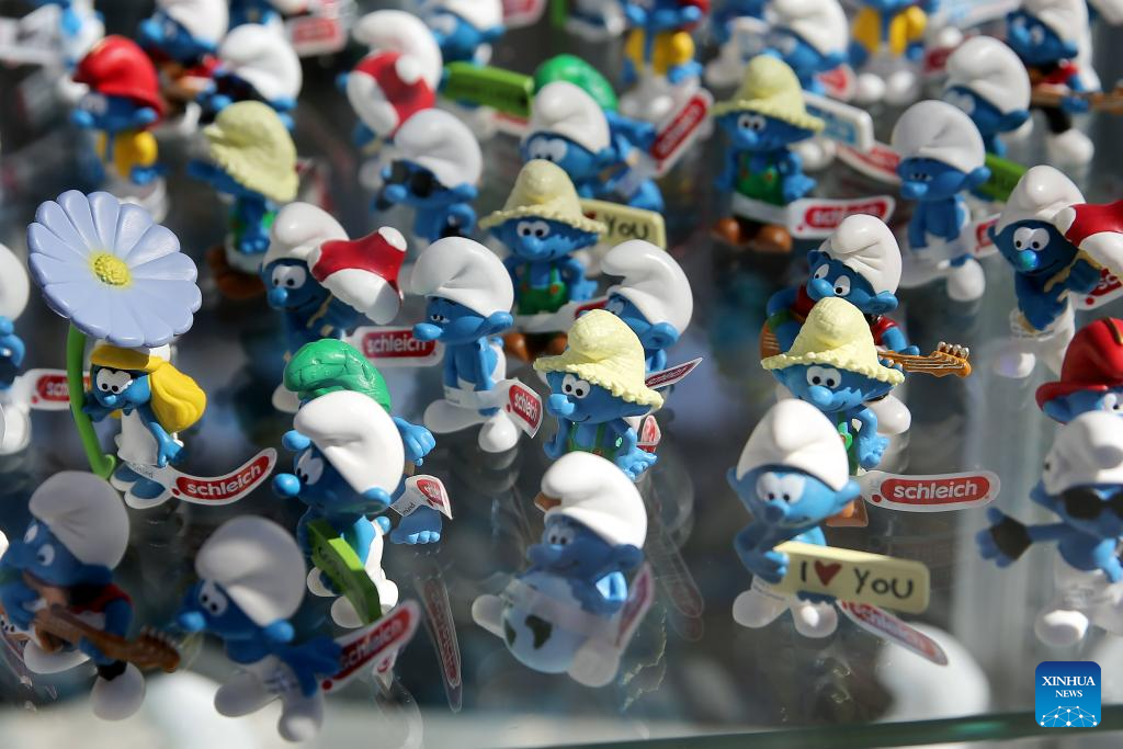Toy models of the Smurfs are seen during the BD Comic Strip Festival in Brussels, Belgium, on Sept. 8, 2023. The BD Comic Strip Festival kicked off here on Friday. (Xinhua/Zhao Dingzhe)
