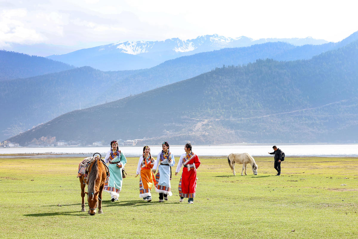 Photo taken on April 17, 2023 shows people wandering in Napa Lake Wetland in Shangri-La, Deqen Tibetan Autonomous Prefecture, southwest China's Yunnan Province. (Photo/ People’s Daily Online)