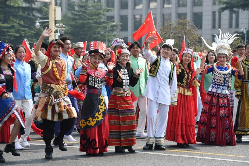 A formation featuring ethnic unity takes part in a mass pageantry celebrating the 70th founding anniversary of the People's Republic of China (PRC) in Beijing, capital of China, Oct. 1, 2019. (Xinhua/Fan Peishen)