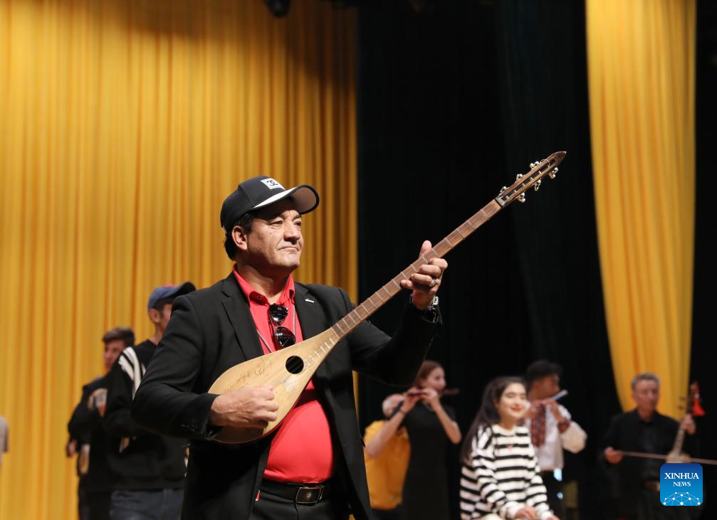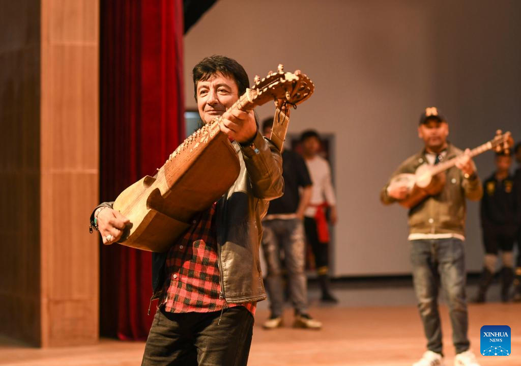 An artist of a local art troupe plays the traditional instrument during a rehearsal in Taxkorgan Tajik Autonomous County, northwest China's Xinjiang Uygur Autonomous Region, Sept. 4, 2023. Taxkorgan Tajik Autonomous County has made great efforts in the integration of local culture and tourism in recent years, enriching the cultural life of people and promoting foreign exchanges. The county also carries forward traditional Chinese culture to build cultural tourism festivals, which shows the scenery of the Pamir Plateau and the happy and stable life of the people. (Xinhua/Wang Fei)