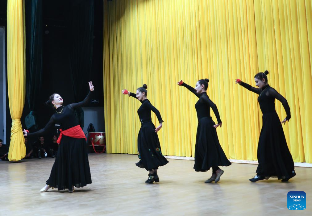 Artists of a local art troupe rehearse a dance in Taxkorgan Tajik Autonomous County, northwest China's Xinjiang Uygur Autonomous Region, Sept. 4, 2023. Taxkorgan Tajik Autonomous County has made great efforts in the integration of local culture and tourism in recent years, enriching the cultural life of people and promoting foreign exchanges. The county also carries forward traditional Chinese culture to build cultural tourism festivals, which shows the scenery of the Pamir Plateau and the happy and stable life of the people. (Xinhua/Lan Hongguang)