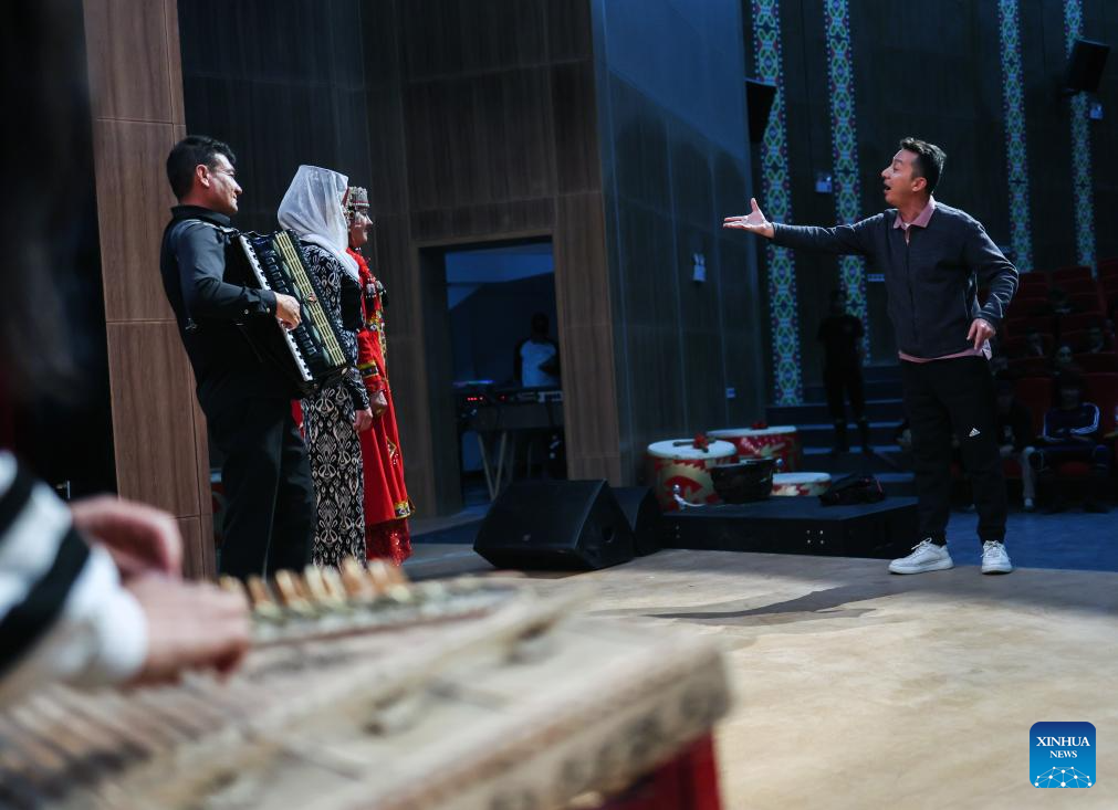An artist directs a rehearsal in Taxkorgan Tajik Autonomous County, northwest China's Xinjiang Uygur Autonomous Region, Sept. 4, 2023. Taxkorgan Tajik Autonomous County has made great efforts in the integration of local culture and tourism in recent years, enriching the cultural life of people and promoting foreign exchanges. The county also carries forward traditional Chinese culture to build cultural tourism festivals, which shows the scenery of the Pamir Plateau and the happy and stable life of the people. (Xinhua/Lan Hongguang)