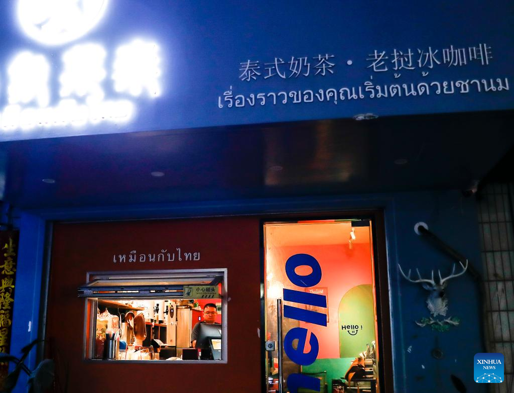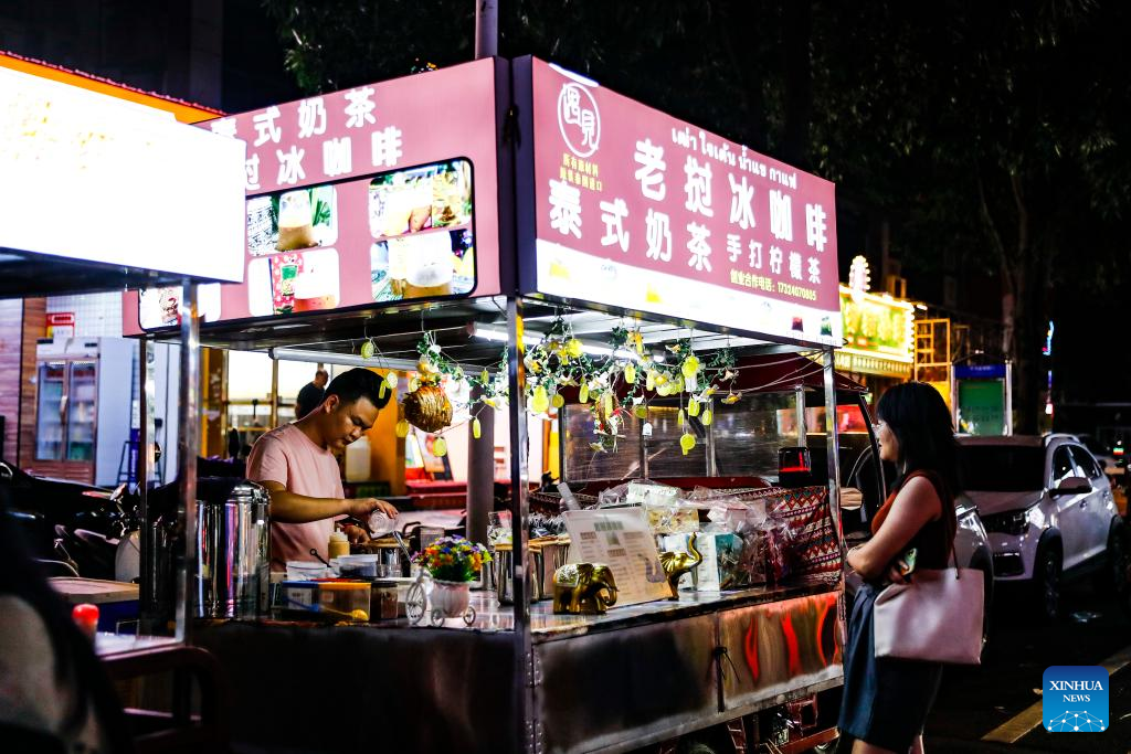 A customer visits a night market stall selling Southeast Asian beverages in Nanning, south China's Guangxi Zhuang Autonomous Region, Sept. 8, 2023.
