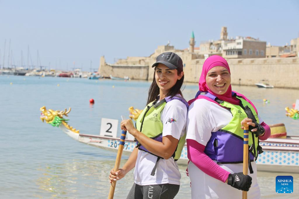 Participants pose for photos during a dragon boat race in Akko, Israel, on Sept. 8, 2023. A dragon boat race was held in northern Israel on Friday, with hundreds of paddlers from 17 teams nationwide competing in the Mediterranean Sea. (Xinhua/Wang Zhuolun)