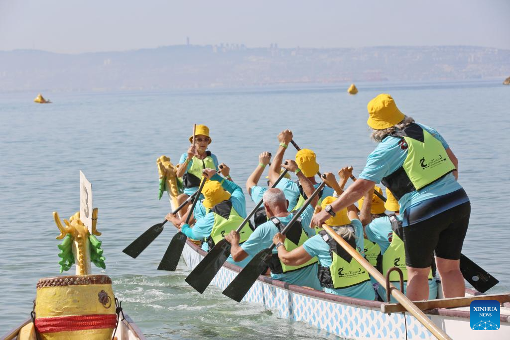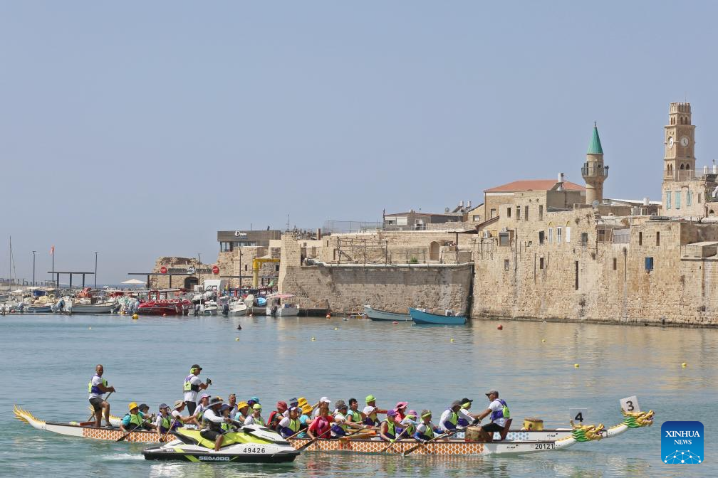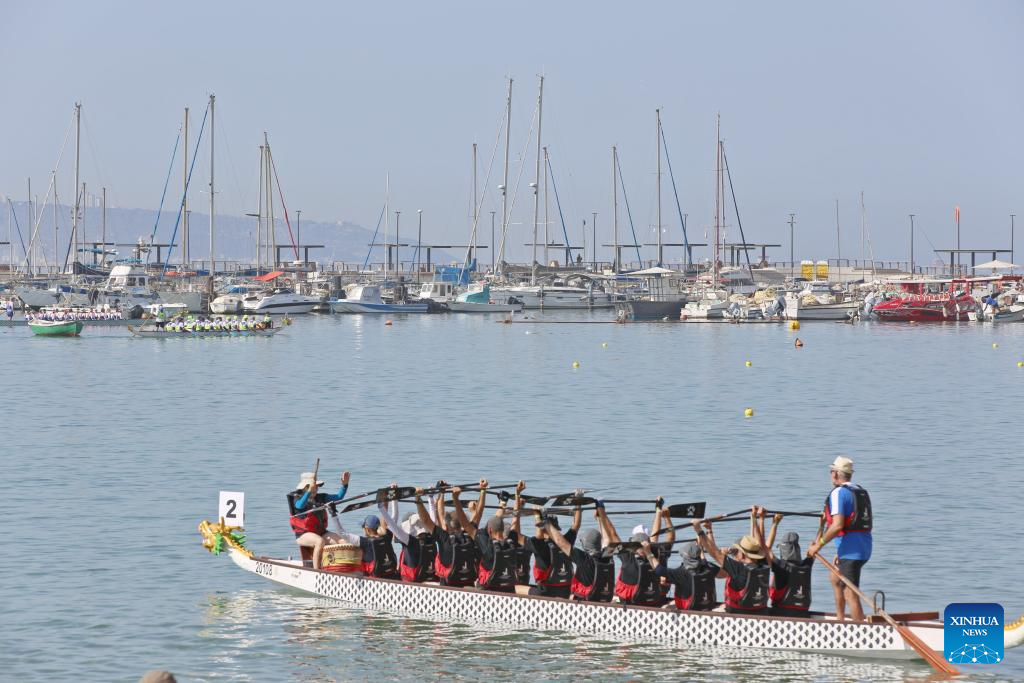 Participants compete during a dragon boat race in Akko, Israel, on Sept. 8, 2023. A dragon boat race was held in northern Israel on Friday, with hundreds of paddlers from 17 teams nationwide competing in the Mediterranean Sea. (Xinhua/Wang Zhuolun)