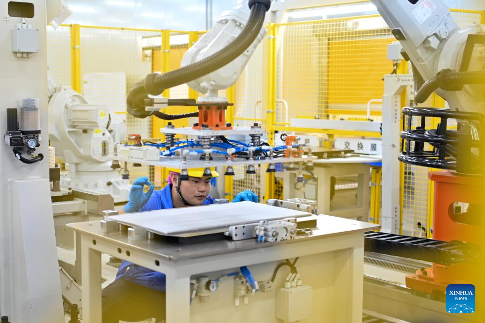 A staff member operates intelligent production equipment at a workshop of SVOLT Energy Technology Co., Ltd. in Yancheng, east China's Jiangsu Province, Sept. 8, 2023. Yancheng has boosted green and low-carbon development by advancing new energy industries such as wind and photovoltaic power in recent years. (Xinhua/Li Bo)