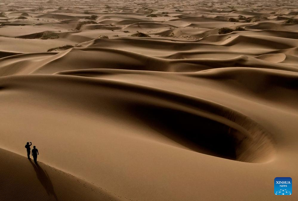 This aerial photo taken on Sept. 7, 2023 shows the scenery of a desert scenic spot in Makit County of Kashgar, northwest China's Xinjiang Uygur Autonomous Region. Makit County, located on the southwestern rim of the Taklimakan Desert, has taken advantage of its natural resources to develop tourism and provide jobs for the local people. (Xinhua/Li An)