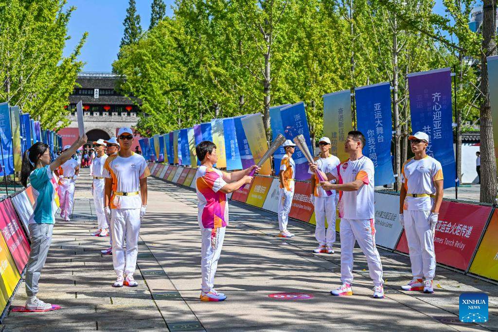 The photo taken on Sept. 10, 2023 show the starting ceremony of the torch relay of the 19th Asian Games in Jiaxing, east China's Zhejiang Province, Sept. 10, 2023. (Xinhua/Sun Fei)