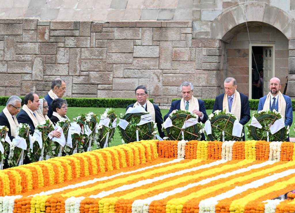 Chinese Premier Li Qiang and other leaders at the 18th G20 Summit offer floral tributes to the Memorial of Mahatma Gandhi in New Delhi, India, Sept. 10, 2023. (Xinhua/Rao Aimin)