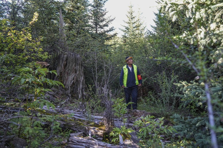 A villager patrols in the forest in Gaiba Village of Gongbo'Gyamda County in Nyingchi City, southwest China's Tibet Autonomous Region, July 20, 2023. (Xinhua/Sun Fei)