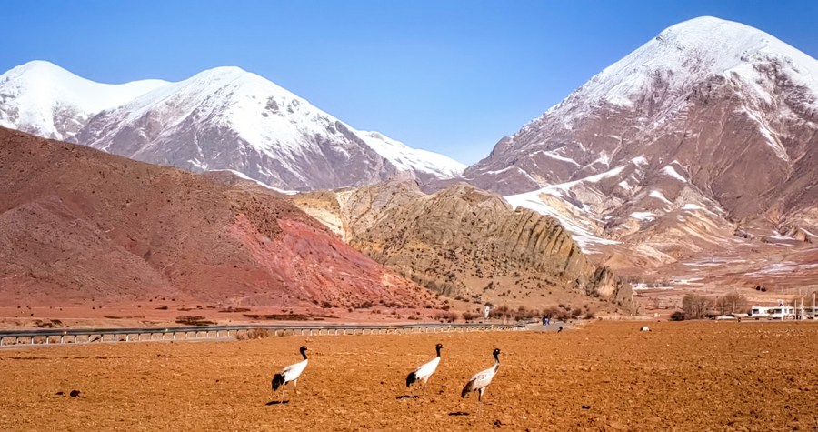 This photo taken on March 1, 2023 shows black-necked cranes in Lhunzhub County of Lhasa, southwest China's Tibet Autonomous Region. (Xinhua/Shen Hongbing)