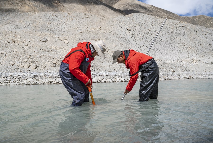 Scientific research members from Tibet University collect aquatic life samples near the mountaineering base camp in the Qomolangma National Nature Reserve in southwest China's Tibet Autonomous Region, May 22, 2023. (Xinhua/Sun Fei)
