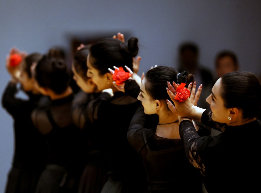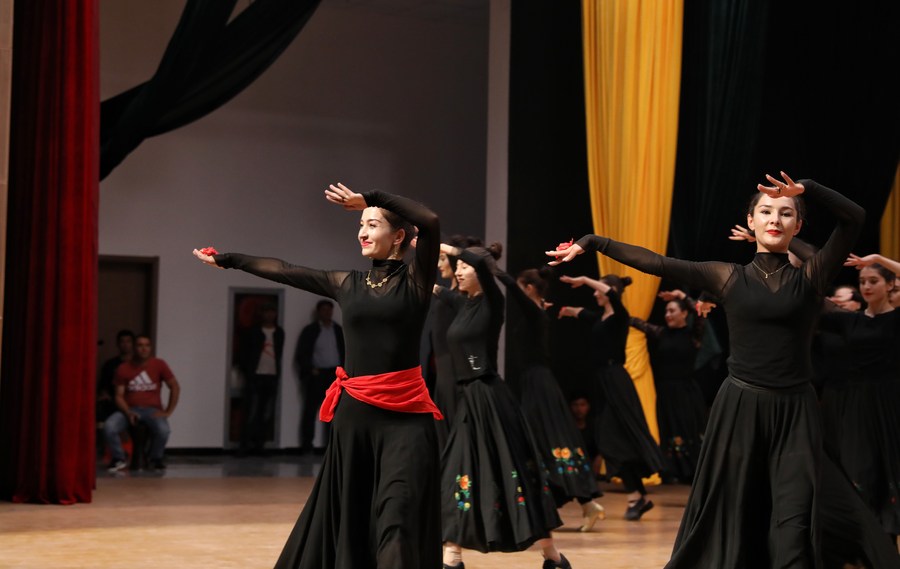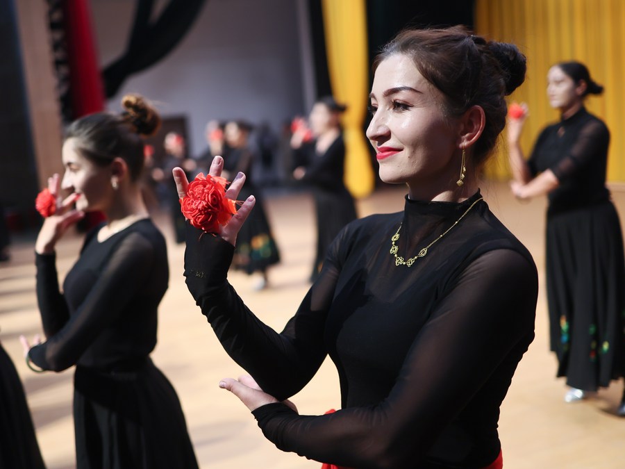 Artists of a local art troupe rehearse a dance in Taxkorgan Tajik Autonomous County, northwest China's Xinjiang Uygur Autonomous Region, Sept. 4, 2023. (Xinhua/Wang Fei)