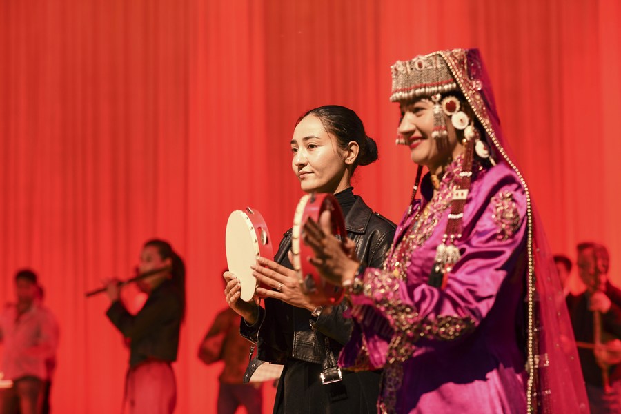 Artists of a local art troupe rehearse a program in Taxkorgan Tajik Autonomous County, northwest China's Xinjiang Uygur Autonomous Region, Sept. 7, 2023. (Xinhua/Hu Huhu)