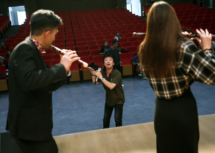 An artist directs a rehearsal in Taxkorgan Tajik Autonomous County, northwest China's Xinjiang Uygur Autonomous Region, Sept. 4, 2023. (Xinhua/Lan Hongguang)