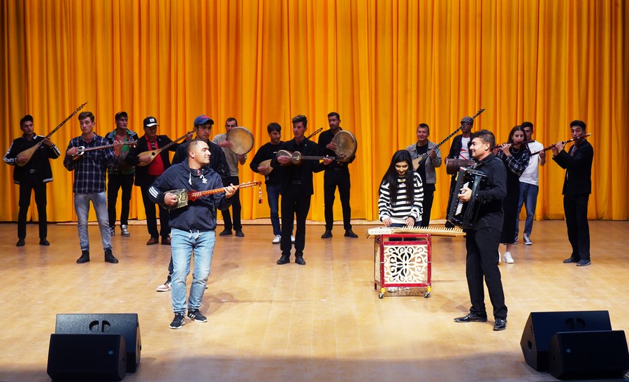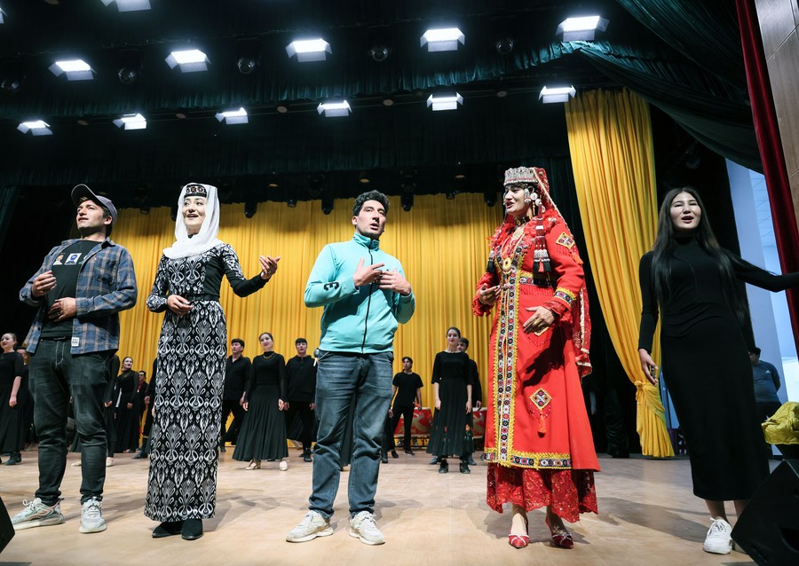 Artists of a local art troupe rehearse a program in Taxkorgan Tajik Autonomous County, northwest China's Xinjiang Uygur Autonomous Region, Sept. 4, 2023. (Xinhua/Jin Haoyuan)