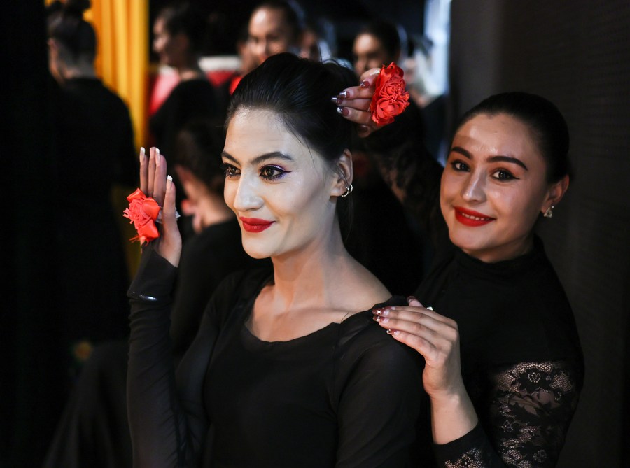 Dancers of a local art troupe wait for a rehearsal at a theater in Taxkorgan Tajik Autonomous County, northwest China's Xinjiang Uygur Autonomous Region, Sept. 4, 2023. (Xinhua/Lan Hongguang)