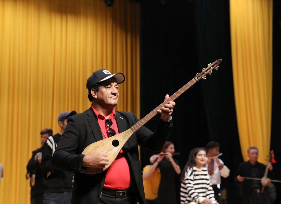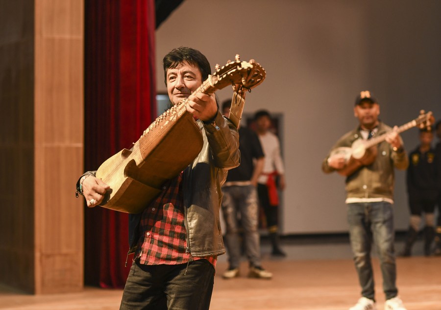 An artist of a local art troupe plays the traditional instrument during a rehearsal in Taxkorgan Tajik Autonomous County, northwest China's Xinjiang Uygur Autonomous Region, Sept. 4, 2023. (Xinhua/Cheng Tingting)
