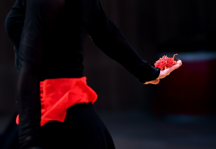 Gulbanur Kurqak, a dancer of a local art troupe, rehearses a dance in Taxkorgan Tajik Autonomous County, northwest China's Xinjiang Uygur Autonomous Region, Sept. 4, 2023. (Xinhua/Lan Hongguang)