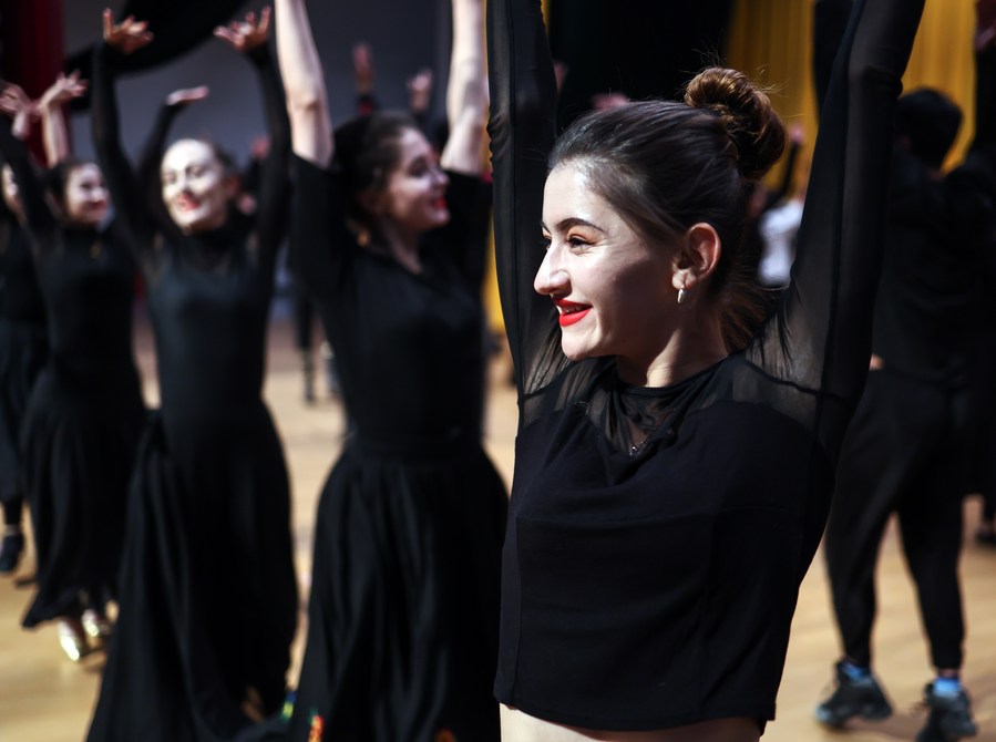 Artists of a local art troupe rehearse a dance in Taxkorgan Tajik Autonomous County, northwest China's Xinjiang Uygur Autonomous Region, Sept. 7, 2023. (Xinhua/Hu Huhu)