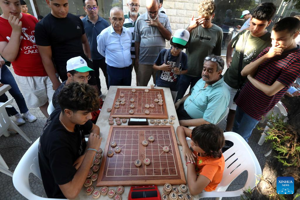 Participants compete during the Lebanese-Chinese XiangQi Friendship Championship in Deir el Qamar, Mount Lebanon Governorate, Lebanon, on Sept. 10, 2023. A competition for Chinese chess, called XiangQi, organized by the XiangQi Committee in Lebanon, was held on Sunday in Deir el Qamar, a historic town in southern-central Lebanon, attracting about 70 Lebanese and Chinese fans of all ages. (Xinhua/Liu Zongya)