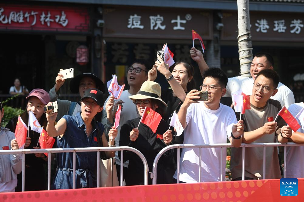 People watch the torch relay of the 19th Asian Games in Shaoxing, east China's Zhejiang Province, Sept. 11, 2023. (Xinhua/Xu Yu)