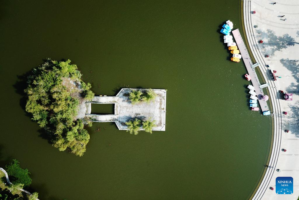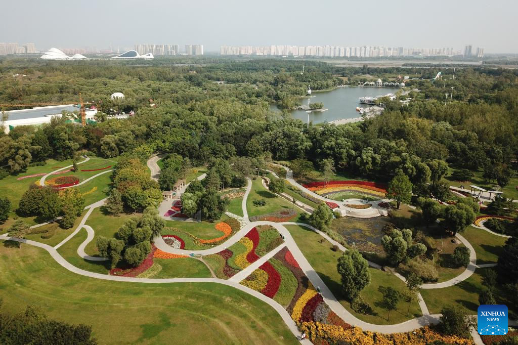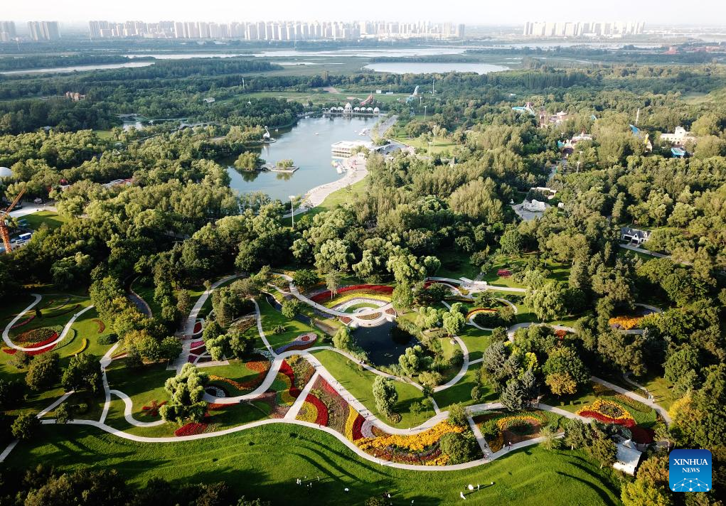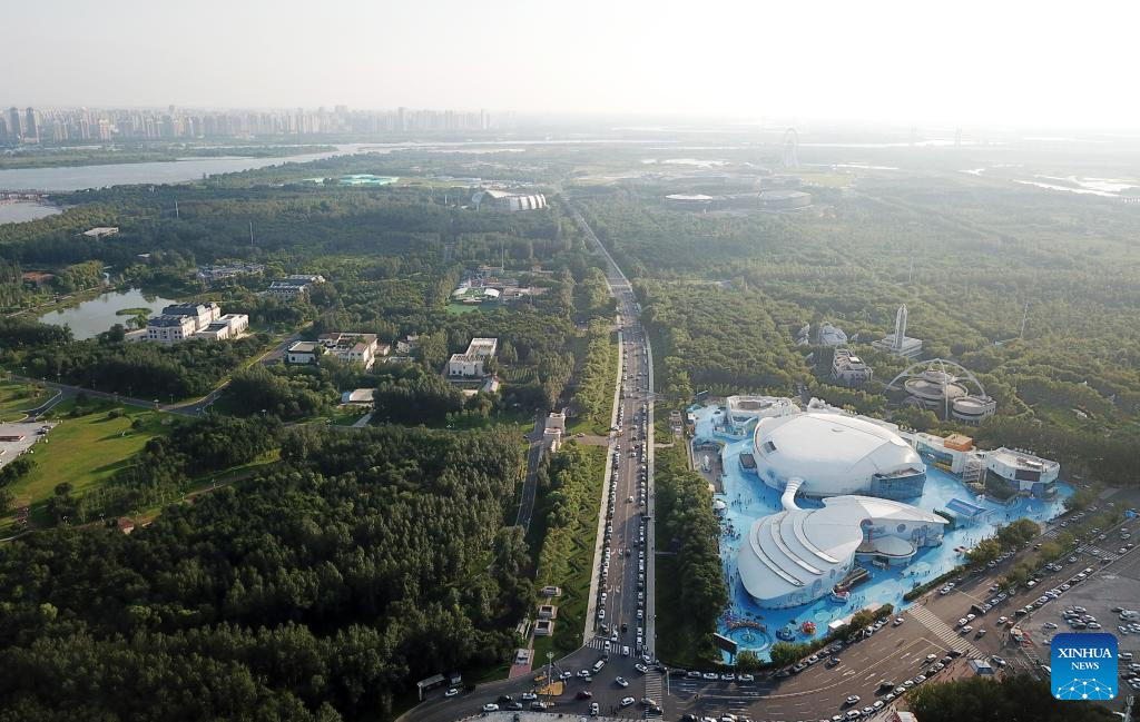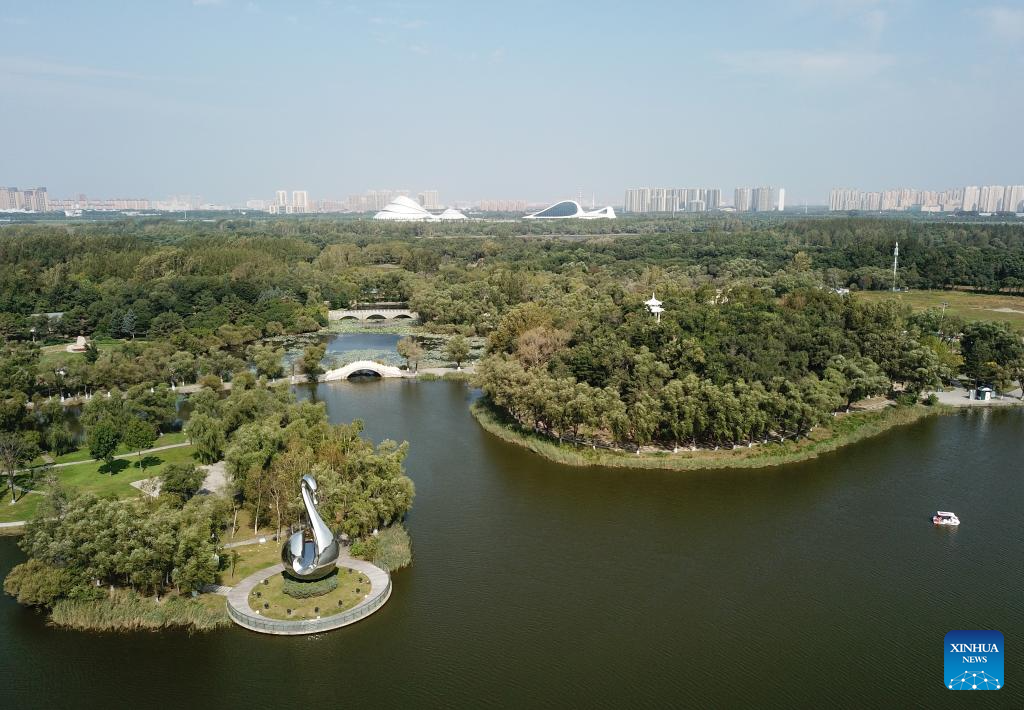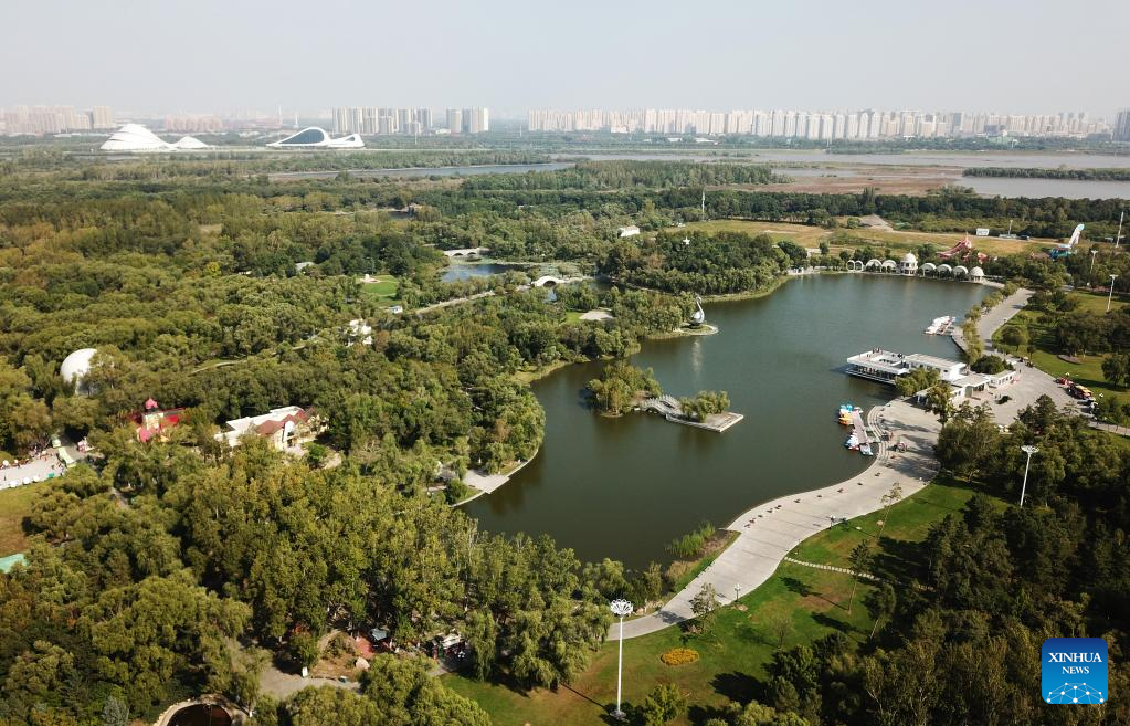 This aerial photo taken on Sept. 11, 2023 shows a view of Sun Island scenic spot in Harbin, northeast China's Heilongjiang Province. Situated on the northern bank of the Songhua River in Harbin City, Sun Island scenic spot offers a multifunctional landscape that combines European-style architecture, rural scenery, folk culture, and ice and snow culture. (Xinhua/Wang Jianwei)