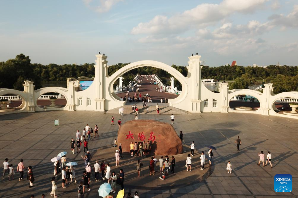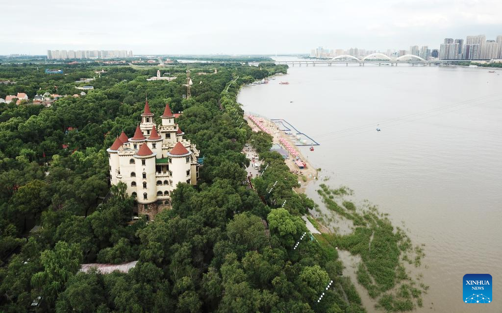 This aerial photo taken on July 31, 2023 shows a view of Sun Island scenic spot in Harbin, northeast China's Heilongjiang Province. Situated on the northern bank of the Songhua River in Harbin City, Sun Island scenic spot offers a multifunctional landscape that combines European-style architecture, rural scenery, folk culture, and ice and snow culture. (Xinhua/Wang Jianwei)