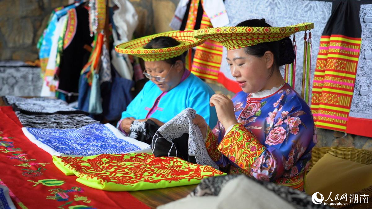 Women of Huayao, a branch of the Yao ethnic group, make handicrafts using an embroidery technique called Tiaohua, or cross-stitch embroidery. (People's Daily Online/Xiang Yu)