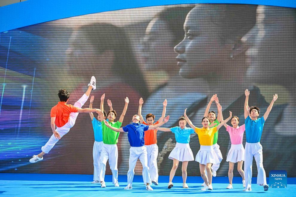 Dancers perform during the beginning ceremony of the torch relay of the 19th Asian Games in Ningbo, east China's Zhejiang Province, Sept. 12, 2023. (Xinhua/Sun Fei)