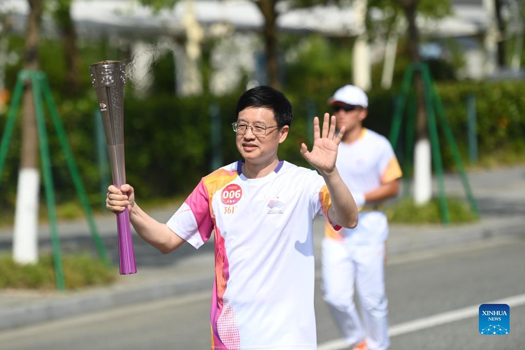 Torch bearer Xie Longlong runs with the torch during the torch relay of the 19th Asian Games in Ningbo, east China's Zhejiang Province, Sept. 12, 2023. (Xinhua/Huang Zongzhi)