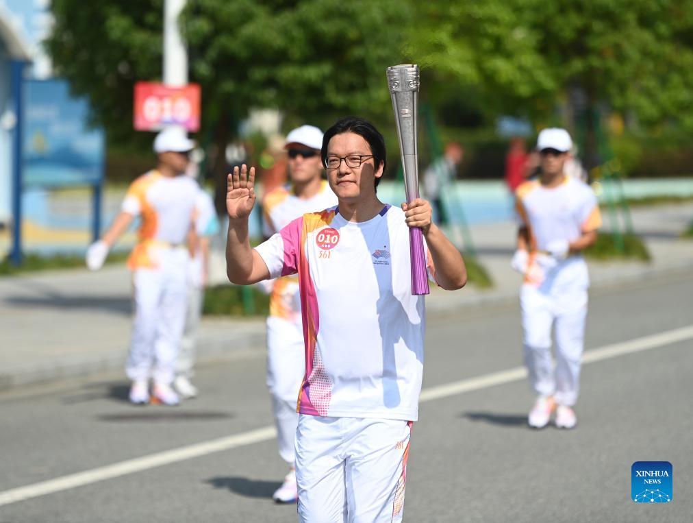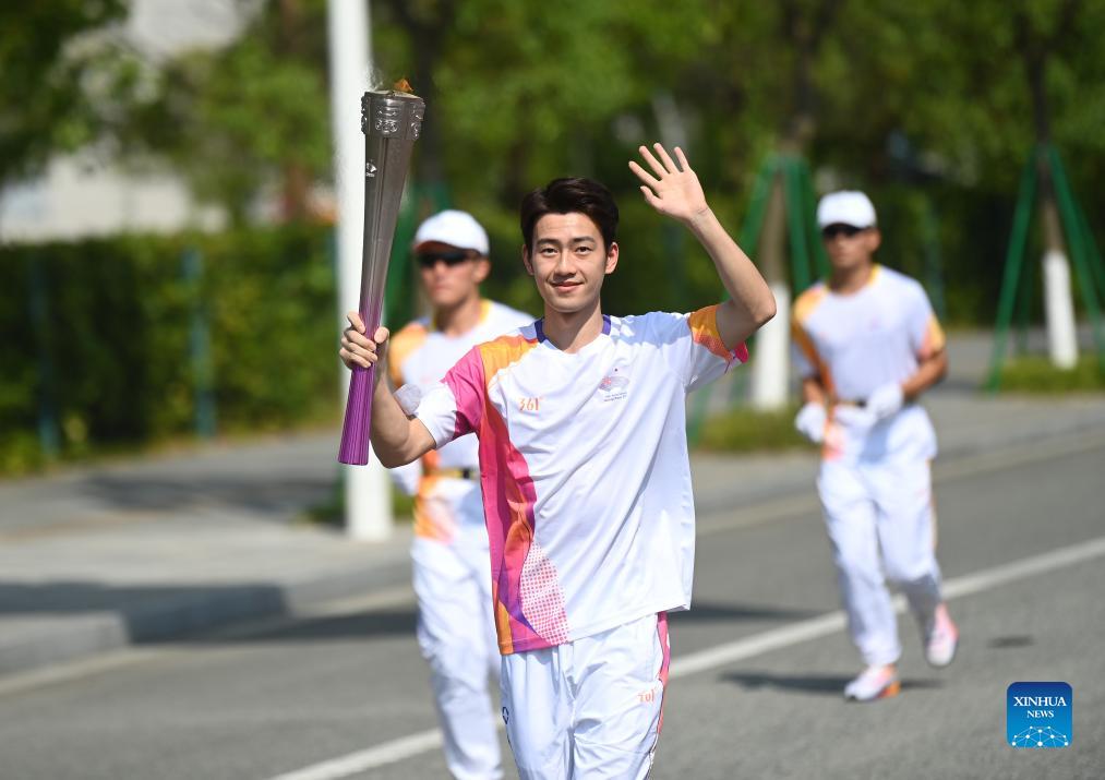 Torch bearer Wang Chang runs with the torch during the torch relay of the 19th Asian Games in Ningbo, east China's Zhejiang Province, Sept. 12, 2023. (Xinhua/Huang Zongzhi)