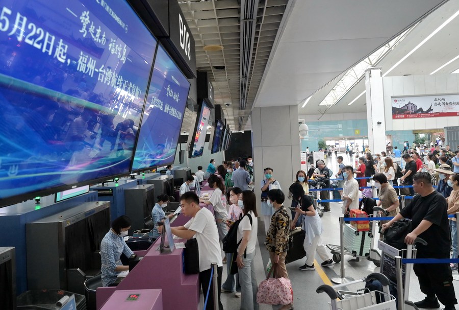 Passengers check in their luggage at the Fuzhou Changle International Airport in Fuzhou, capital of southeast China's Fujian Province, May 22, 2023. (Xinhua/Lin Shanchuan)