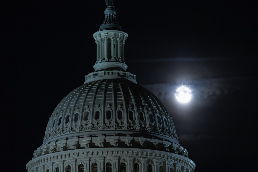 A full moon is seen behind the U.S. Capitol Dome, in Washington, D.C., the United States, Aug. 30, 2023. (Photo by Aaron Schwartz/Xinhua)