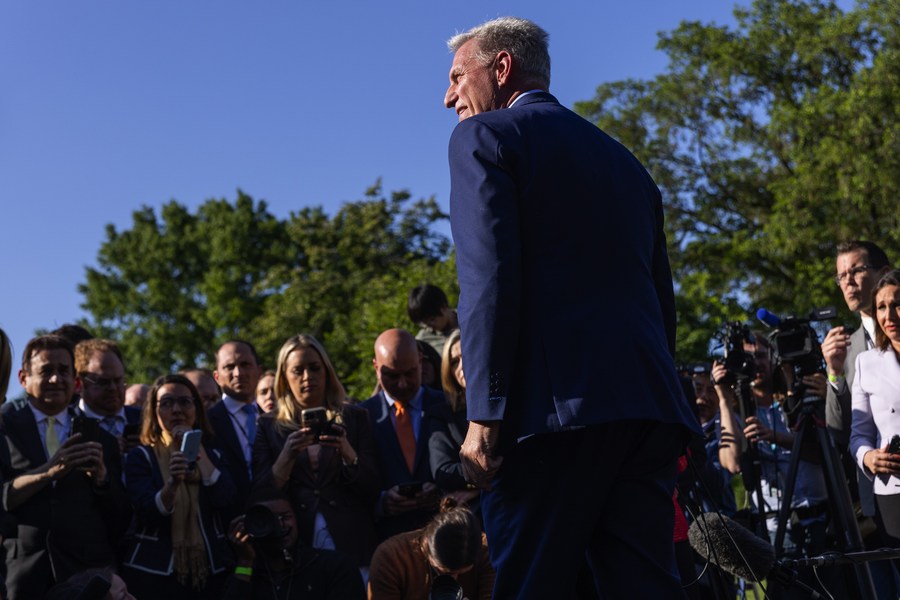 Republican House Speaker Kevin McCarthy speaks to the press after a high-profile debt ceiling meeting in Washington, D.C., the United States, May 9, 2023. (Photo by Aaron Schwartz/Xinhua)