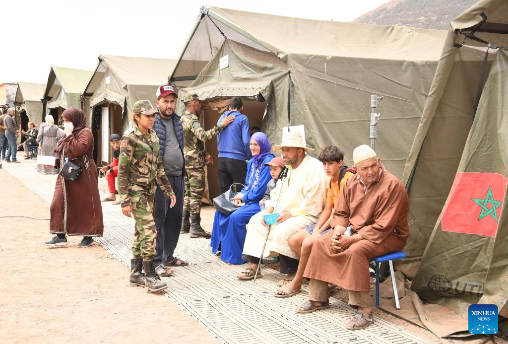 A temporary hospital specially installed for the earthquake is seen in Al Haouz Province, Morocco, Sept. 12, 2023. By Monday evening, the earthquake had killed 2,862 people and injured at least 2,562 in Morocco, according to the latest update from the Interior Ministry. (Photo by Saouri Aissa/Xinhua)