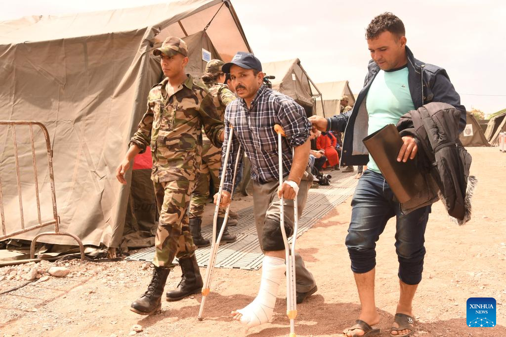 A rescue staff member guides victims at a temporary hospital specially installed for the earthquake in Al Haouz Province, Morocco, Sept. 12, 2023. By Monday evening, the earthquake had killed 2,862 people and injured at least 2,562 in Morocco, according to the latest update from the Interior Ministry. (Photo by Saouri Aissa/Xinhua)