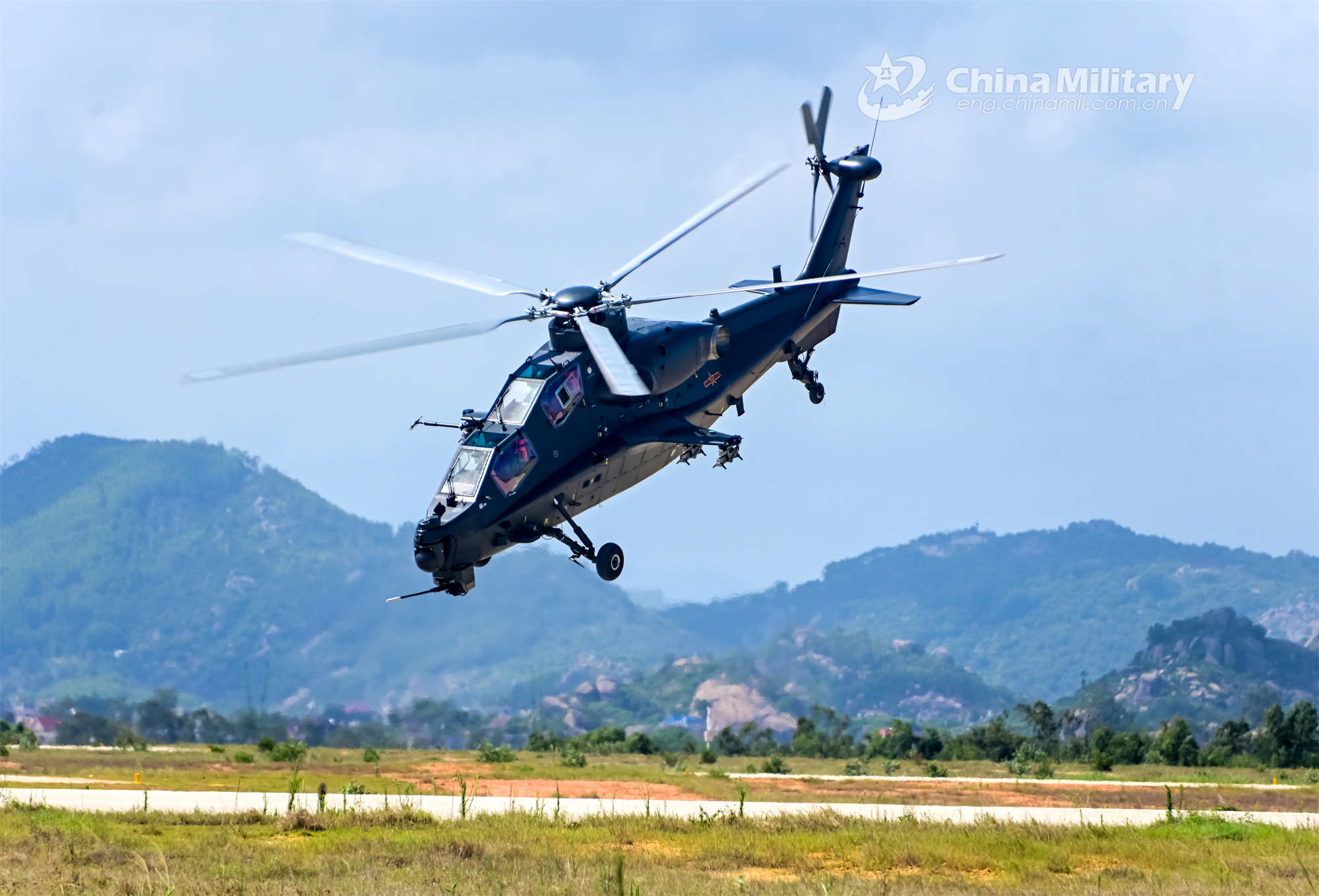 A WZ-10 attack helicopter attached to an army aviation brigade lifts off in emergency receiving a scramble order during a real-combat flight training exercise on August 31, 2023. (eng.chinamil.com.cn/Photo by Li Shilong)