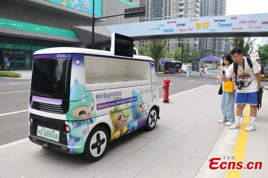 An unmanned ice cream vending car attracts visitors at the 19th Asian Games Village in Hangzhou, east China's Zhejiang Province, Sept. 12, 2023. (Photo: China News Service/Qian Chenfei)