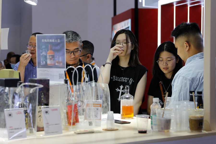 Visitors taste whisky at the booth of Japan during the 2023 China International Fair for Trade in Services (CIFTIS) at China National Convention Center in Beijing, capital of China, Sept. 4, 2023. (Xinhua/Liu Mengqi)